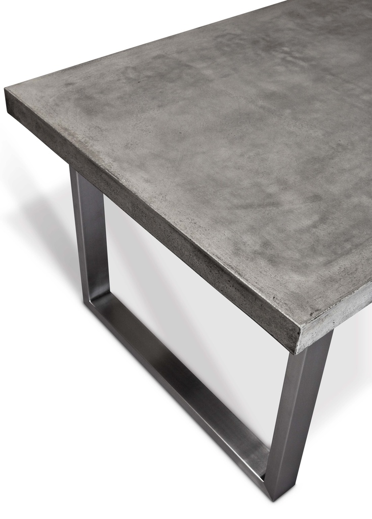 The Miller Dining Table is solid and stately in form. Made for indoor or outdoor enjoyment, Miller is crafted with a sturdy slab of natural Dark gray concrete, and is completed with stainless steel U-legs. | Overall Dimensions: 83 x 40 x 30